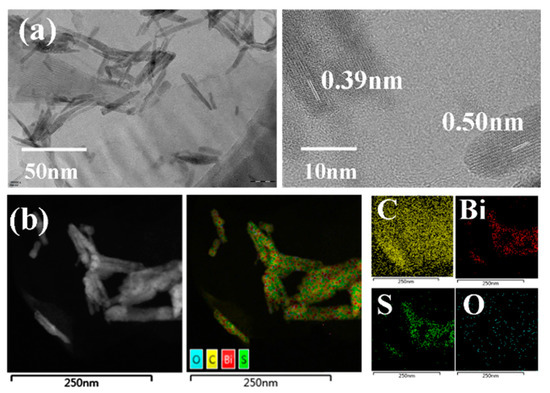 (a) TEM and HRTEM images of the GO/Bi2S3 NPs; (b) HAADF and EDS mapping.