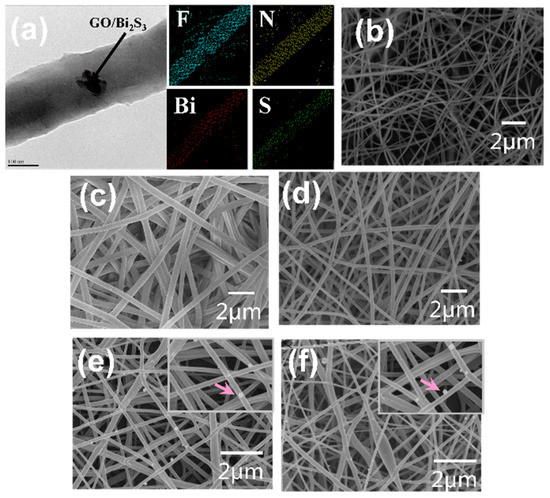 Figure 3a shows the TEM image of the GO/Bi2S3-PVDF/TPU nanofiber (left) and elements mapping of the F, N, Bi, and S (right); the elements mapping image demonstrates the uniform distribution of GO/Bi2S3 NPs among the PVDF/TPU nanofibers. The SEM images of pristine PVDF and TPU, PVDF/TPU, GO-PVDF/TPU, and GO/Bi2S3-PVDF/TPU nanofibers are shown in Figure 3b–f, respectively. As shown in Figure 3b–f, the surfaces of the PVDF, TPU, and PVDF/TPU nanofibers are smooth. The surfaces of the GO-PVDF/TPU and GO/Bi2S3-PVDF/TPU nanofibers are relatively rough. The compositions and structural parameters averages of different samples are exhibited in Table 1. Due to the inherent properties of polymers, the average diameter of the TPU nanofibers is thicker than the PVDF, which results in an uneven thickness of the PVDF/TPU composite nanofibers. Our previous work has shown that the addition of metal oxides and GO to the spinning solution increases the conductivity and reduces the viscosity of the spinning solution, so that nanofibers with thinner diameters can be obtained under the same spinning parameters [18,19]. The results (Table 1) show that the nanofiber diameters of GO-PVDF/TPU and GO/Bi2S3-PVDF/TPU are smaller than those of PVDF, TPU, and PVDF/TPU, which also supports the conclusion mentioned above.