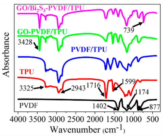 Furthermore, the FTIR spectrum was used to verify the formation of the PVDF/TPU, GO-PVDF/TPU, and GO/Bi2S3-PVDF/TPU composite membranes, as shown in Figure 4. The spectrum of the pristine PVDF and TPU are consistent with literature reports [20,21,22,23,24,25,26,27]. The characteristic absorption peaks of PVDF are observed at 877 cm−1, 1174 cm−1, and 1402 cm−1, which are attributed to the skeletal vibration of the C–C bonds and the stretching vibrations of the C–F and C–H groups, respectively. For the TPU membrane, typical peaks around 1599 and 1716cm−1 are observed due to the N-H flexural absorption and stretching vibration of the carbonyl group in the amide, respectively. The absorption peaks at 2943 and 3325 cm−1 are attributed to the –CH2– asymmetric stretching vibration and the stretching vibration of N–H in the urethane group, respectively. Other characteristic bands of TPU can also be observed in the FTIR spectra of TPU. Compared with the FTIR spectrum of pristine PVDF and TPU, the FTIR spectra of PVDF/TPU contains all the characteristic peaks of both PVDF and TPU, proving the formation of PVDF/TPU composite membranes. In comparison with PVDF/TPU, a new peak appeared at 3428 cm−1 caused by the stretching vibration of C=C in GO, illustrating the presence of GO in PVDF and TPU. Other absorption peaks related to GO vanished in the FTIR spectra of GO-PVDF/TPU due to coinciding with the peaks of other components. Moreover, the stretching vibration of Bi–S is observed in the FTIR spectra of the GO/Bi2S3-PVDF/TPU, indicating that the Bi2S3 NPs were favorably embedded on the surface of GO [11].