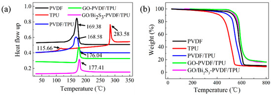 The thermal behaviors of the PVDF, TPU, PVDF/TPU, GO-PVDF/TPU, and GO/Bi2S3-PVDF/TPU membranes were evaluated by differential scanning calorimetry (DSC) and TGA, as shown in Figure 5a,b. The DSC curve of PVDF presents an endothermic peak at 169.38 °C, which represents a typical melting peak of the PVDF. The DSC curve of TPU shows two endothermic peaks at 115.66 °C and 283.58 °C, which are caused by the melting of the soft segment and the hard segment of TPU, respectively. On the DSC curve of the PVDF/TPU membrane, there is only one endothermic peak, and the endothermic peak of the soft segment of TPU disappears. With the addition of GO and GO/Bi2S3 NPs, the melting temperatures of the GO-PVDF/TPU and GO/Bi2S3-PVDF/TPU composite membranes increased correspondingly.