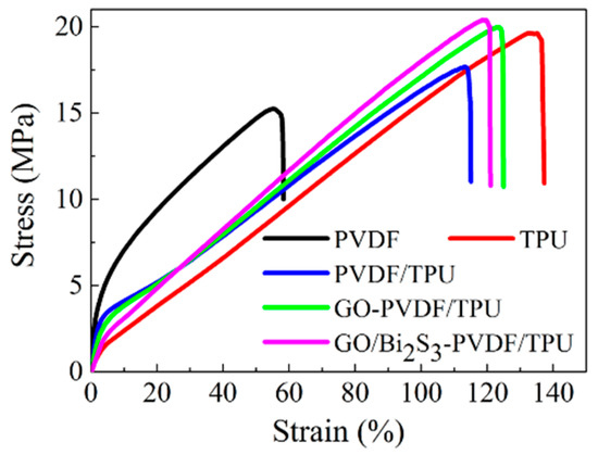 In the process of production, cutting, and transportation, photothermal conversion materials are required to have some strength. Thus, the mechanical property of photothermal conversion material is an important parameter to evaluate the material properties. Figure 6 shows the mechanical properties of the PVDF, TPU, PVDF/TPU, GO-PVDF/TPU, and GO/Bi2S3-PVDF/TPU membranes, and the maximum strengths and elongations at break of the various membranes are listed in Supplementary Table S1. As shown in Figure 6, the stress and elongation-at-break of PVDF/TPU can be improved with the addition of TPU, owing to the existence of flexible polar crystals existing in TPU [29]. Moreover, with the respective introduction of GO and GO/Bi2S3, compared with the PVDF/TPU membrane, the mechanical performance of the GO-PVDF/TPU and GO/Bi2S3-PVDF/TPU membranes further evidently improved. This can be explained by the formation of hydrogen bonds or other covalent bonds between nanoparticles and polymer molecules, which makes the interface interaction strongly conducive to effective stress transfer in the process of stretching, thus improving the mechanical properties. In fact, GO has excellent mechanical properties and can improve the mechanical properties of the membrane [30,31].