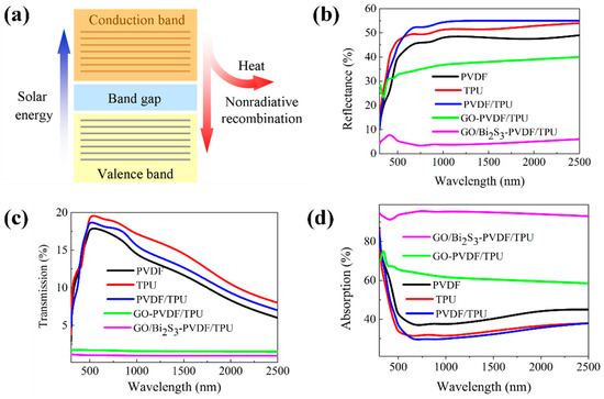 When a semiconductor material is illuminated, electron holes pairs are created with the energy similar to the bandgap. The excited electrons eventually return to the lower energy level through a non-radiative relaxation and release heat as phonons, thereby establishing a temperature distribution based on light absorption and volume/surface composite properties [32,33]. Figure 7a shows the mechanisms of the light absorption and photothermal conversion. The solar absorption properties of different samples were evaluated by a UV-vis-NIR spectrometer, as shown in Figure 7c. Figure 7a,b displays the transmission and reflectance of the different membranes. As shown in Figure 7a, because of the small pore size and thin thickness, the transmissions of all the membranes are less than 20%. However, the membranes without inorganic additives have lower transmissions than GO-PVDF/TPU and GO/Bi2S3-PVDF/TPU, which have 2% and 1%, respectively. GO has a high reflectance due to its dependence on the incident light angle and high refraction, resulting in a higher reflectance of the GO-PVDF/TPU membrane (approximately 30%) than that of the GO/Bi2S3-PVDF/TPU membrane (approximately 5%) [4]. According to formula (2), GO/Bi2S3-PVDF/TPU has the highest light absorption (nearly 95%), followed by GO-PVDF/TPU, as shown in Figure 7d. This result can also be explained by the following principle. The multiple reflections and resonance scattering in the absorption materials help to reduce the reflection amount of the incident radiation so as to increase the solar absorption rate [34,35]. GO NPs and Bi2S3 NPs in GO/Bi2S3 composite NPs can interact with each other to increase the reflection and resonance scattering, thereby increasing the absorption rate of the membrane.