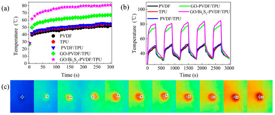 Stability is another important index by which to evaluate the performance of membrane applications. In order to study the stability of the PVDF, TPU, PVDF/TPU, GO-PVDF/TPU, and GO/Bi2S3-PVDF/TPU membranes, the temperature cycle tests of different membranes were carried out by radiation 300 s, naturally cooling for 300 s, and no irradiation subsequently. As shown in Figure 8a, the sample with the GO/Bi2S3-PVDF/TPU membrane heated up rapidly, which is attributed to the narrow bandgap and wide band absorption characteristics of Bi2S3. The final temperatures of the samples (PVDF, TPU, and PVDF/TPU membranes) were similar to the GO-PVDF/TPU and GO/Bi2S3-PVDF/TPU membranes, which is attributed to the low specific heat capacity of GO and Bi2S3 NPs. After five cycles of irradiation, the temperatures of the samples did not decrease significantly, and the initial temperature of each cycle increased slightly, which was caused by the increasing of the ambient temperature due to the irradiation time.