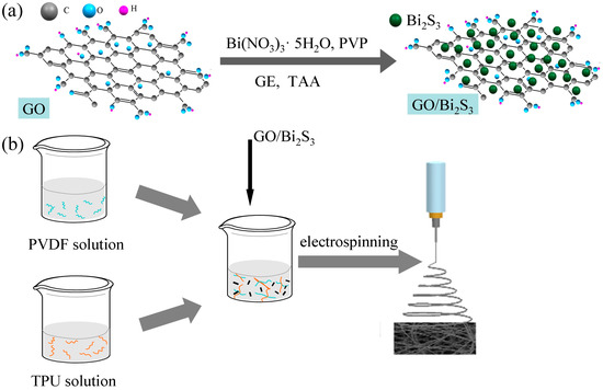 Graphene oxide (GO) aqueous solution was obtained from JCNANO, Inc. (Nanjing, China). Poly (vinylidene fluoride) (PVDF, Mw = 1,100,000) and thermoplastic polyurethane (TPU, Mw = 600,000) were supplied by Solef Co. Ltd. (Shanghai, China) and Basf Co. Ltd. (Shanghai, China). Bismuth nitrate pentahydrate (Bi (NO3)3·5H2O) and polyvinylpyrrolidone (PVP) were provided by Nona technology Co. Ltd. (Hubei, China) and Zhengkun chemical Co. Ltd. (Tianjin, China). Thioacetamide (TAA) and ethylene glycol (EG) were obtained from Jiuding chemical Co. Ltd. (Shanghai, China). N,N-dimethylformamide (DMF), acetone, and ethanol were provided by Aladdin reagent Co., Ltd. (Shanghai, China).