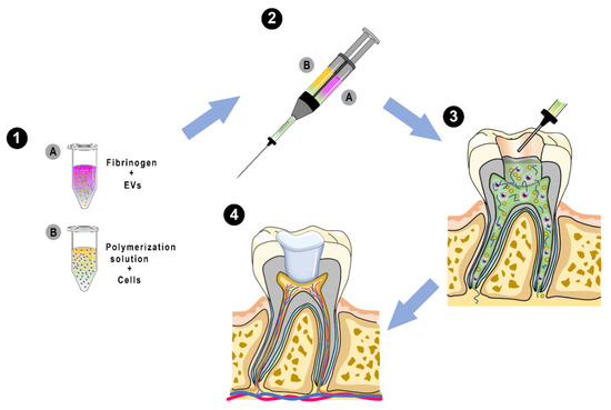 Schematic representation of the proposed in situ pulp tissue regeneration. (1) Preparation of the polymeric solutions for fibrin gel fabrication. Solution (A) includes fibrinogen and extracellular vesicles (EVs). Solution (B) includes polymerization solution with dental pulp stem cells (DPSCs) and human umbilical vein endothelial cell (HUVECs). (2) Co-injection of the polymeric solutions using a dual-barrel syringe. (3) Fibrin gel fits the root canal system and undergoes gelation. (4) Rapid formation of vascular networks in engineered pulp within several days.