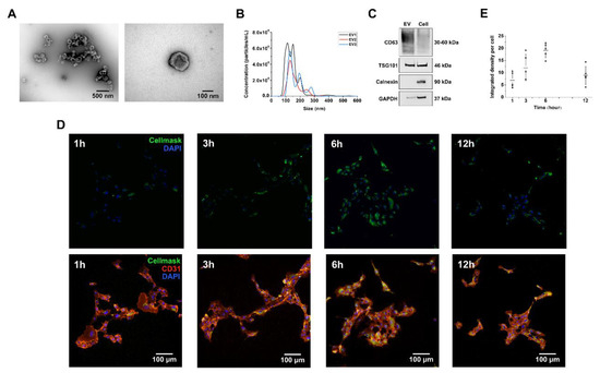 Characterization of DSPC-derived EVs. (A) Representative TEM images of EVs. (B) Size distribution of EVs was determined by nanoparticle tracking analysis (NTA), presented by three biological replicates (EV1–EV3) isolated from different DPSC cell lines. (C) The surface markers of EVs were analyzed by western blotting. (D) The uptake of CellMask Green-labeled EVs by HUVECs (stained with CD31) was visualized after 1, 3, 6 and 12 h of incubation, showing a time-dependent course. (E) The uptake of EVs was quantified as integrated fluorescent density signal per cell. The number of internalized EVs reached the maximum at 6 h.
