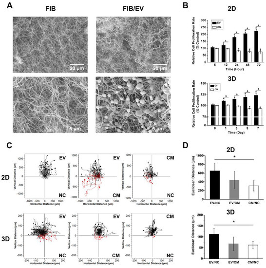 The evaluation of EV-loaded fibrin gel and its effect on cell proliferation and migration. (A) SEM images of fibrin gel surface and EV-loaded fibrin gel surface. (B) Histograms of cellular proliferation in monolayer and fibrin gel as determined by XTT assay. Please note that the 3D system comprises a co-culture of HUVEC and DPSCs with an equal number. (* p < 0.05 between EVs treated group and control, # p < 0.05 between CM treated group and control, & p < 0.05 between EVs and CM treated group). (C) Images of the plotted cellular migration path as determined by chemotaxis assay. The black lines present the HUVEC pathways towards the upper chamber (experimental group), while the red lines show the movement to the lower chamber (control). Data quantified from the experiment are shown in (D). The mean and standard deviation of triplicate experiments are plotted. * p < 0.05.
