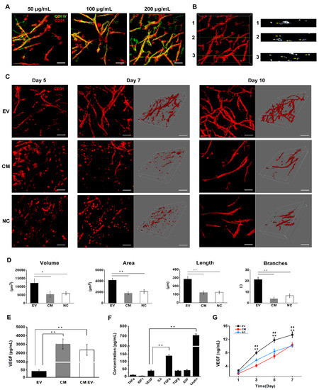 EVs were previously shown to promote vascularization in a dose-dependent manner in monocultures [5,17]. To determine whether this result could be replicated in our system, we optimized the concentration of EVs in the fibrin gels. After seven days under serum-starved culture, co-cultured DPSCs and HUVECs formed tubular structures in a dose-dependent manner in fibrin gels containing increasing concentrations of EVs, with the most extensive tubular network forming at an EV concentration of 200 μg/mL (Figure 4A). In this optimized setup, most HUVECs were aligned, reoriented and sprouted to form new vessels, whereas only a few cells remained in clusters. Surrounding the tubular structures, large amounts of collagen IV were deposited, which is a key component of the vascular basement membrane and may indicate the maturation of vascular structures [18]. Cross-sections of two-photon laser-scanning microscopy (TPLSM) image stacks revealed the formation of a lumen with a diameter of 5–30 μm, thus, confirming vascular maturation (Figure 4B). HUVECs in the EV-loaded fibrin gel began to align and reorient on day 5, and showed extensive branching on day 10 (Figure 4C). In contrast, most HUVECs in the CM and NC samples remained rounded and clustered on day 7, and fewer tubules were present on day 10. The volume, surface area, length, and number of branch points in the tubular structures were evaluated to provide a quantitative analysis of each system, revealing significantly higher values for all four parameters in the EV-loaded fibrin gel compared to the CM and NC groups (Figure 4D). This confirms that the EV-loaded fibrin gel has a much greater proangiogenic potential than the bare fibrin gels.