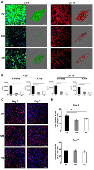Extracellular matrix and apoptosis assays in 3D in vitro culture. (A) Images of collagen deposition in EV-loaded, CM-treated and bare fibrin gels on day 7. (Scale bar: 100 μm) Structure volume and surface area were quantified as parameters and are shown in (B). (C) Apoptosis was examined in situ using a TUNEL assay. (Scale bar: 100 μm) Quantitative data are shown in (D). The mean and standard deviation of triplicate experiments are plotted (* p < 0.05, ** p < 0.01).