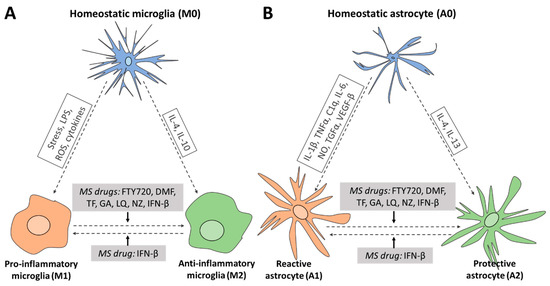 Molecular effects on cell types in the CNS have been reviewed for a number of FDA-approved MS drugs, such as Fingolimod (FTY720; Gilenya), Dimethyl Fumarate (DMF; Tecfidera), Glatiramer Acetate (GA; Copaxone), Interferon-beta (IFN-β; Rebif, Avonex, Betaseron, Extavia, Plegridy) and Teriflunomide (TF; Aubagio) [17,18,19,20,21,22,23,24,25,26,27,28]. The CNS-directed molecular effects of more recently approved drugs, such as Laquinimod (LQ; Nerventra), Natalizumab (NZ; Tysabri), Alemtuzumab (AZ; Lemtrada) and Orcelizumab (OCR; Ocrevus), have been less well described, except for the neuroprotective effects of LQ and NZ [29,30,31]. In general, each of these previous studies has reported the (molecular) effects of only one or two MS drugs (e.g., [28,29,31]) on one or two CNS cell types (e.g., [22]). Moreover, the protective effects of MS drugs on neurons and oligodendrocytes have often been attributed to indirect effects caused by the actions of MS drugs on peripheral immune cells (e.g., [28]). Therefore, the effects of MS drugs have not been documented in multiple CNS cell types nor integrated into a common molecular cascade of events. The goal of the present review is to describe and compare the molecular effects of the traditional and recent FDA-approved MS drugs on multiple CNS cell types, focusing on microglia within the generally applied homeostatic (M0), pro-inflammatory (M1) and anti-inflammatory (M2) designation [32,33], and on astrocytes within the homeostatic (A0), reactive (A1) and neuroprotective (A2) nomenclature [34], as well as on neurons and oligodendrocytes.