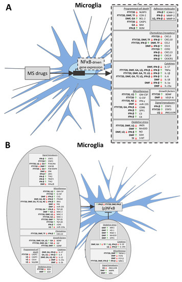 Because the outside-in model has been the norm for a long time, the currently available MS drugs approved by the Food and Drug Administration (FDA) have been mainly designed to target various cell types within the peripheral immune system [11] and most drug-impact studies have been directed towards their peripheral effects on the cells of the adaptive immune system [12]. However, it is likely that the MS drugs also affect (innate) CNS cells and the molecular cascades associated with neuroinflammation, since most genes that are dysregulated in MS-peripheral immune cells are also expressed in microglia [13]. MS drug effects on CNS pathology have been mostly studied in humans and animals on the basis of the clinical features of disease progression, magnetic resonance imaging (MRI) measures, and blood or cerebrospinal fluid (CSF) levels of biomarkers for demyelination and neuronal degeneration [14,15,16]. For this reason, we set out to review studies assessing at the molecular level, the effects of MS drugs on the pathways operational in CNS cells.