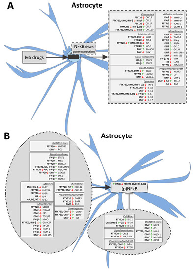 As in microglia cells, in astrocytes IFNs show an effect on the pro-inflammatory and apoptosis-related pathways STAT1/21 and NFκB. Both IFN-β and IFN-α increased the STAT1/2 expression levels and the degree of phosphorylation of STAT1/2 in EAE mice [222] as well as in human fetal astrocytes [222], primary mouse astrocyte cultures [217] and mixed mouse glial cultures [209]. IFN-β also increased the levels of nuclear p65 NFκB in the mouse EAE model [222], and high doses of this IFN induced cell death and decreased the protein levels of the NFκB-inhibitor IκB in serum-starved primary rat fetal astrocytes [236].