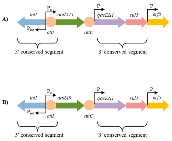 - Deng, Y.; Bao, X.; Ji, L.; Chen, L.; Liu, J.; Miao, J.; Chen, D.; Bian, H.; Li, Y.; Yu, G. Resistance integrons: Class 1, 2 and 3 integrons. Ann. Clin. Microbiol. Antimicrob. 2015, 14, 45. [Google Scholar] [CrossRef]