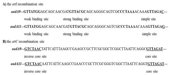 (A) Nucleotide sequences of the attI site associated with the class 1 integron gene cassettes aadA9 and aadA11 in studied T. pyogenes isolates. The weak, strong, and simple sites of the class 1 integrase binding are in bold. Differences in one nucleotide in the attI site sequences between aadA9 and aadA11 cassettes are in bold and underlined. (B) Nucleotide sequences of the attC sites associated with the class 1 integron gene cassettes aadA9 and aadA11 in T. pyogenes. Sequences of the inverse core sites and core sites for both gene cassettes are in bold and underlined.