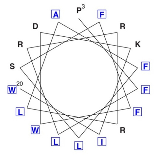 N-terminal portion of the SRMS unique domain. Residues Pro3–Trp20 were plotted on a helical wheel diagram using PEPWHEEL (www.bioinformatics.nl/cgi-bin/emboss/pepwheel). Hydrophobic residues are shown in blue with boxes.