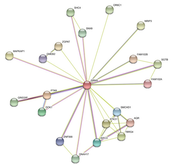 The understanding of SRMS function is still in its very early stages, particularly compared to the well-studied Src family kinases. Functional characterizations of the other Brk family kinases (Frk and Brk) are even further described. Numerous substrates for these kinases were identified, with both growth-promoting and growth-suppressing signaling roles depending on the cell and tissue context [4,5]. Brk is expressed primarily in epithelial cells within the gastrointestinal tract, skin, and prostate, where it plays a role in cell differentiation. SRMS is expressed widely in normal mammalian tissue samples and in several cancer cell lines. No apparent defects were present in SRMS-deficient mice, suggesting that SRMS might have roles that are normally redundant with other tyrosine kinases [1]. Knockdown of SRMS expression with siRNA was used to shed light on the normal functions of the kinase. In MDA-MB-231 cells, SRMS was shown to be necessary for EGF-stimulated tyrosine phosphorylation of Sam68 [35]. Knockdown of SRMS in U2OS human osteosarcoma cells led to a depletion of LC3 (microtubule-associated protein 1 light chain 3 alpha), indicative of an increase in autophagic flux. Thus, SRMS could play a role as an inhibitor of autophagy [60]. As noted above, the identification of SRMS substrates provided important clues to the function of the kinase. Using bioinformatics approaches, the available proteomic data was recently incorporated into an interaction database to elucidate the SRMS signaling network [61]. We performed a STRING analysis [62] to identify protein–protein interactions involving SRMS (Figure 4). The known and predicted SRMS interactions show potential connections to a number of other signaling proteins, including Ser/Thr kinase 31, sorting nexin 8, SHC-transforming protein 4, and the target of rapamycin complex 2 subunit MAPKAP1 (Figure 4).