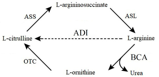 - Shen, L.-J.; Beloussow, K.; Shen, W.-C. Modulation of arginine metabolic pathways as the potential anti-tumor mechanism of recombinant arginine deiminase. Cancer Lett. 2006, 231, 30–35. [Google Scholar] [CrossRef]