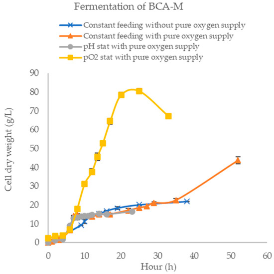 BCA-M was produced in fed-batch fermentation with different feeding strategies, as shown in Figure 2. The cell growth was limited in fed-batch fermentation without pure oxygen supply and it entered the stationary phase with a maximum average cell dry weight (CDW) of 21.8 g/L culture at 38 h. Thereby, pure oxygen supply to fermentation was performed. In this process, 60% pure oxygen-to-air ratio was applied to sustain the dissolved oxygen level at above 20% for efficient cell growth, which resulted in a high average CDW of 43.7 g/L. To further enhance cell growth, computerized feeding strategies, pH stat and pO2 stat, were investigated. From the growth curve studies using pH stat, the highest average CDW was 16.5 g/L in 29 h fermentation. By using the pO2 stat feeding system and the supply of pure oxygen, high cell density culture was achieved with an average CDW of 80.6 g/L in 23 h fermentation. Feeding the cells controlled by pO2 stat with pure oxygen supply resulted in the highest cell density. Figure 2 and Table 1 show the summary of the highest cell dry weight by the four feeding strategies.