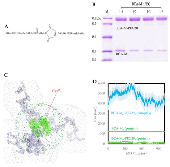 As shown in Figure 4B, the attachment of a single molecule of PEG20 to BCA-M was expected at the position of Cys161, as confirmed by mass spectrometry (MS). The calculated molecular weights of BCA-M and BCA-M-PEG20 are 32.6 kDa and 53.8 kDa, respectively.