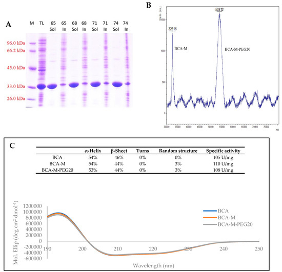 Characterization of BCA, BCA-M and BCA-M-PEG20. (A) BCA-M purification by heat treatment, from 65 to 74 °C. M = marker; TL = total lysate; Sol = soluble fraction; In = insoluble fraction. (B) MALDI-TOF-MS spectrum of BCA-M-PEG20 (expected molecular weight = 32.45 kDa). (C) Circular dichroism (CD) spectra and specific activities of BCA, BCA-M and BCA-M-PEG20.