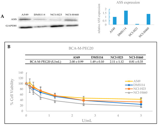 BCA-M-PEG20 of various concentrations was applied into the culture medium of A549, DMS114, NCI-H23 and NCI-H460 cell lines. All these lung cancer cell lines were ASS-positive, as confirmed by Western blot (Figure 5A). The 50% growth inhibition (IC50) values of BCA-M-PEG20 on A549, DMS114, NCI-H23 and NCI-H460 were 2.00 ± 0.99, 1.49 ± 0.10, 2.11 ± 1.12 and 0.81 ± 0.35 U/mL, respectively (Figure 5B).