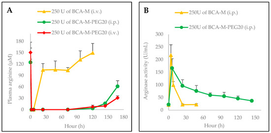 For pharmacodynamic studies, normal BALB/c mice, n = 3 and 6–8 weeks old, were randomly assigned into groups. A single i.v. or i.p. injection of 250 U/mouse of BCA-M or BCA-M-PEG20 were administered on day 0. Blood samples were collected from the saphenous vein in the hind leg before (0 h) and after drug administration at the time points of 2, 6, 24, 48, 72, 96, 120, 144 and 168 h. Collected samples were mixed with 10% sulfosalicylic acid for protein precipitation. The supernatant was collected and mixed with an equal volume of lithium citrate loading buffer (Biochrom, Cambourne, UK), then applied to the amino acid analyzer (model L-8800, Hitachi) for plasma arginine level determination.