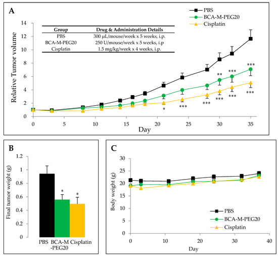In vivo antitumor activities of BCA-M-PEG20. (A,B) Tumor growths (relative tumor volume and final tumor weight) were significantly suppressed by BCA-M-PEG20 and cisplatin (n = 10). (C) Mice body weights were measured regularly. Results are presented as means ± SEM. For relative tumor volume, multiple comparisons were performed using two-ways ANOVA with Bonferroni’s post-tests. For final tumor weight, data were analyzed using Mann–Whitney U-test. * p < 0.05, ** p < 0.01 and *** p < 0.001. All analyses were performed using the Prism software (GraphPad Software Inc, La Jolla, CA, USA).
