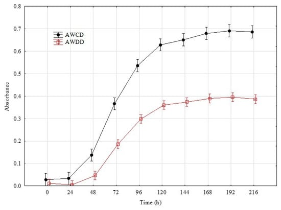 The optical density at 490 nm (substrate consumption, catabolism, respiration) and 750 nm (turbidity, growth, biomass formation) was determined using a microplate reader (Biolog®, Hayward, CA, USA) on a daily basis to calculate Average Well Colour Development (AWCD) and Average Well Density Development (AWDD) indices, respectively, as suggested by Jeszka-Skowron et al. [29].