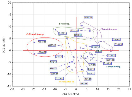 Principal component analysis (PCA) calculated on the basis of the pathogenic fungi and beneficial Trichoderma isolates’ response to FF Biolog® substrates at 192 h (n = 3).