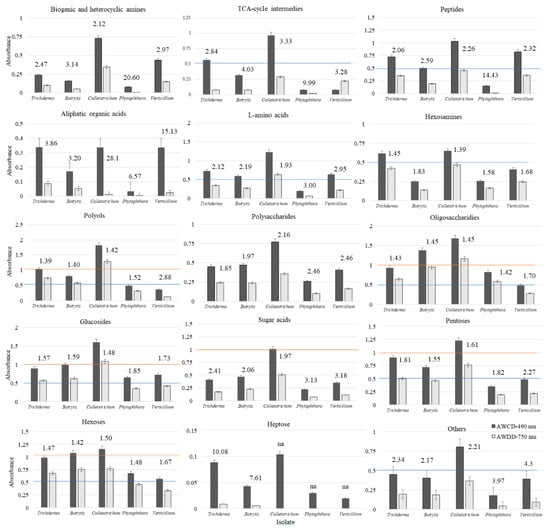 What is more, a stressful metabolic situation, indicated by the ratio of both AWCD to AWDD (Figure 3) was met when using L-amino acids, sugar acids and others for Phytophthora sp. and Verticillium sp. Stressful situation was noted on TCA-cycle intermediates and biogenic and heterocyclic amines for all tested pathogens, but not Trichoderma spp. Peptides caused metabolic stress only for Phytophthora sp., heptose for Trichoderma spp. and Botrytis sp., whereas aliphatic organic acids caused metabolic stress for Trichoderma spp. and all pathogens.