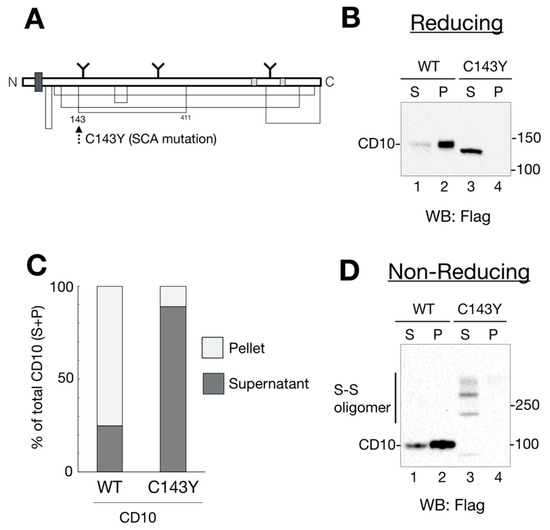 Recently, CD10 has been identified as a causative gene for SCA [10]. To explore the outcome of cysteine mutation in CD10, we developed expression vectors of WT and the SCA mutant CD10 with a point mutation C143Y (Figure 1A). As a first step to understanding the influence of the C143Y mutation in SCA 43 development, functional characterization of CD10, including protein maturation, intracellular transport, and enzyme activity, was carried out using HeLa cells because endogenous CD10 protein expression was hardly detected by our experimental system (Supplementary Figure S1). Of note, we used mouse CD10 cDNA, which has a 97.7% similarity to that of human CD10. Structural features, including the transmembrane region, catalytic domain, and cysteine positions, were mostly conserved.