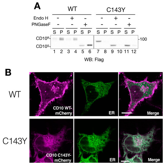Next, we addressed the deficiency of intracellular transport of CD10 by the consequence of C143Y mutation. We performed endo H digestion of N-glycan to monitor the cellular localization of CD10. Endoglycosidase H (Endo H) processes only ER and the medial-Golgi form of N-glycan on the glycoproteins; therefore, this treatment reveals the cellular localization of glycoproteins by mobility shift in Western blotting. The migration remained unchanged by either mock treatment or endo H digestion in WT CD10 (compare lanes 1–2 and 3–4 in Figure 2A), indicating that N-glycans of WT CD10 exogenously expressed in HeLa cells were appropriately modified at the Golgi during transport to the cell surface. On the other hand, CD10 C143Y was completely sensitive to the endo H treatment (compare lanes 7–8 and 9–10 in Figure 2A). This mobility shift was indistinguishable from that of PNGase F digestion, which removes N-linked glycan irrespective of the cellular localization of the glycoproteins (Figure 2A, lanes 11–12). These results suggest that WT CD10 is transported to the cell surface, whereas intracellular transport of the C143Y mutant is limited to the ER and medial-Golgi region.