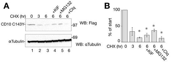 To identify the cellular degradation pathway, transfected cells were CHX-chased for 6 h in the presence of ERAD inhibitory drugs or lysosome inhibitors. Kifunensine (KIF) inhibits ER mannosidase I and stabilizes ERAD substrate proteins [17,18]. MG132 and Clq are proteasome and lysosome inhibitors, respectively. As shown in Figure 4A,B, the degradation of CD10 C143Y was slightly recovered by ERAD inhibitors KIF and MG132 compared to that under conditions of CHX alone at 6 h (Figure 4A, lanes 3–5). The lysosome inhibitor Clq, however, showed no recovery effect on CD10 (Figure 4A, compare lanes 3 and 6), suggesting that CD10 C143Y is not transported to the lysosome for degradation, and autophagy is not involved in CD10 C143Y turnover (Figure 4A, lane 6).