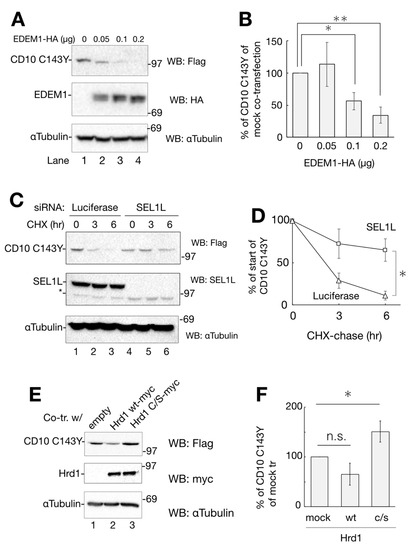 Next, we attempted to identify the factors involved in CD10 C143Y degradation. In our effort to establish the pathway, we inspected representative ERAD factors, EDEM1, SEL1L, and Hrd1. As EDEM1 accelerates the degradation rate of different misfolded proteins in ERAD [19,20,21], we examined whether overexpression of EDEM1 promotes ERAD of CD10 C143Y. As the amount of co-expression of HA-tagged EDEM1 increased, the remaining cellular expression level of CD10 C143Y decreased (Figure 5A,B). SEL1L, a component of Hrd1 retrotranslocation machinery situated in the ER membrane, acts as an adaptor for EDEM1 (and also XTP3B and OS-9) in which EDEM1 delivers misfolded proteins to SEL1L [22,23,24]. Next, we performed an RNAi experiment to knockdown SEL1L gene expression and to verify its role in the degradation of CD10 C143Y. Compared to the negative control (luciferase; Figure 5C, lanes 1–3), RNAi to SEL1L decreased the SEL1L protein expression level (Figure 5C, lanes 4–6). In this condition, CD10 C143Y degradation was significantly delayed in CHX-chase (Figure 5C,D). These results suggest that SEL1L is required for efficient CD10 C143Y turnover.