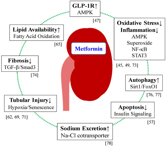 Under diabetic conditions, mTOR is activated and plays an important role in the damage, apoptosis and fibrotic response of renal cells as well as epithelial-to-mesenchymal transition (EMT) [58,59]. Metformin attenuates mTOR-mediated tubular injury under diabetic conditions [60,61,62]. LKB-1 and AMPK have been shown to prevent tubulo-interstitial fibrosis. Impaired fatty acid oxidation (FAO) in proximal tubular cells has been shown to be associated with TIF because of a reduced energy deficiency, which is prevented by metformin [63,64]. Metformin has been shown to attenuate tubulo-interstitial fibrosis via the phosphorylation of AMPK and its target ACC, which is a key regulator of FAO, thereby increasing the lipid availability [65]. Finally, metformin attenuates apoptosis by inhibiting advanced glycation end product (AGE)-mediated NF-κB activation and reactive oxidative species (ROS) generation in renal tubular cells [66,67]. These findings indicate that metformin has protective effects on glomerular constituent cells and renal tubular cells under diabetic conditions.