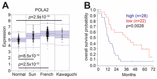 Gene expression and overall survival probability: Gene expression analysis was performed using the R2 genomics analysis and visualization platform (http://r2.amc.nl). Default settings were used to compare expression of POLA1 and POLA2 in a set for normal brain samples (n = 172, Berchtold set) to adult glioma samples (n = 153, Sun set; n = 40, Kawaguchi set; n = 284, French set). Overall survival probability for POLA1 and POLA2 was determined using default settings applied to the Kawaguchi dataset.