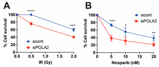 One key piece of data connecting POLA2 to DNA repair is the decreases in cellular survival after genotoxic stresses (Figure 3). Cells lacking POLA2 demonstrated increased sensitivity to Niraparib, a PARP1 small-molecule inhibitor [27]. The sensitivity to PARP1 inhibition is commonly associated with a defective HR repair pathway [26]. In addition, we found that loss of POLA2 also sensitizes cells to IR, a hallmark characteristic of DSB repair failure, whether it is loss of HR or NHEJ repair [19,20,21,23,24]. These data suggest a more functional role in DSB repair for POLA2.