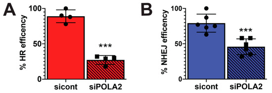 The delay in DSB foci repair and increased sensitivity to DNA damaging agents is often connected to a functional loss in the NHEJ or HR repair pathways [19,20,21]. Interestingly, we found that loss of POLA2 impaired both NHEJ and HR repair pathways. This is an important piece of data due to the fact that the NHEJ repair pathway is functional throughout the cell cycle, while HR repair is restricted to S and G2 [30]. The impairment in NHEJ repair suggests that the requirement for POLA2 in DSB repair is cell cycle-independent.