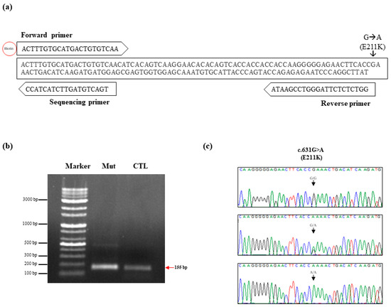 (a) Schematic design of pyrosequencing to detect the E211K somatic mutation of the bovine prion protein gene (PRNP). (b) Gene-specific primers were used to obtain 155 bp amplicons of the bovine PRNP gene containing K211 mutation and E211 wild type. Marker: 100 bp DNA ladder marker; Mut: K211 mutation sample; CTL: E211 normal sample. (c) Electropherograms of Sanger sequencing results. The upper panel indicates Sanger sequencing results of the DNA amplicon with 100% E211 normal sample. The middle panel indicates Sanger sequencing results of mixed DNA amplicons with 50% E211 normal sample and 50% K211 mutation sample. The lower panel indicates Sanger sequencing results of DNA amplicon with 100% K211 mutation sample.