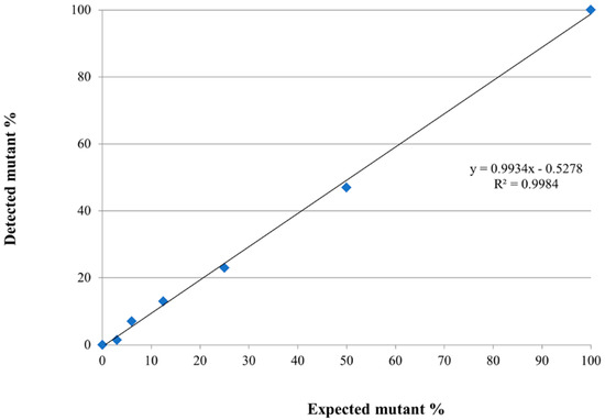 Validation of the detection accuracies of pyrosequencing. The scatter plot indicates the average of the observed somatic mutation rates of the standard materials with mutation rates of 100%, 50%, 25%, 12.5%, 6%, 3%, and 0%. Regression analysis was performed to determine the correlation between the observed somatic mutation rates and the expected somatic mutation rates.