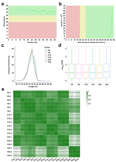 Sequencing data quality control and miRNA feature identification. (a) The mean quality scores of the small RNA-seq (sRNA-seq) data. bp, base pair. (b) The per sequence quality scores of the sRNA-seq data. (c) The length distribution of the miRNAs in different groups. For convenience, “C6”, “C12”, and “C24” indicate the control groups at 6, 12, and 24 h post-infection (hpi), respectively; “V6”, “V12”, and “V24” indicate Vibrio anguillarum-infected groups at 6, 12, and 24 hpi, respectively. nt, nucleotide. (d) Boxplot showing the expression patterns of the miRNAs in different groups at different time points. TPM, transcripts per million. (e) The correlation matrix of the miRNA expressions among the samples of different groups at different time points. For each group at each time point, three individual fish (indicated by the postfix number of 1, 2, or 3) were used. The correlation coefficients among the samples are indicated by numbers.