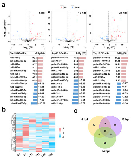 Expression patterns of the differentially expressed miRNAs (DEmiRs). (a) Volcano plots of DEmiRs at 6, 12, and 24 h post-infection (hpi). “up” and “down” indicate up- and down-regulated DEmiRs, respectively. FC, fold change. The top 15 up- and down-regulated DEmiRs and their FC in expression at each time point are shown below the corresponding volcano plot. (b) Heat-map showing the expression profiles of the DEmiRs in different groups at different time points. For convenience, “C6”, “C12”, and “C24” indicate the control groups at 6, 12, and 24 hpi, respectively; “V6”, “V12”, and “V24” indicate the Vibrio anguillarum-infected groups at 6, 12, and 24 hpi, respectively. (c) Venn diagram showing overlapping DEmiRs at different time points.