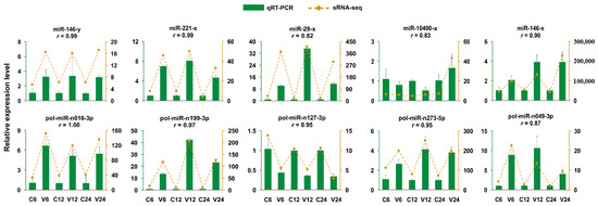 Validation of differentially expressed miRNAs (DEmiRs) by qRT-PCR. The expression profiles of 10 DEmiRs were evaluated by qRT-PCR and compared with that obtained by sRNA-seq. Results are shown as means ± standard deviation (n = 3). For each DEmiR, the correlation coefficient (r) between the results of qRT-PCR and sRNA-seq is indicated.