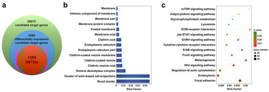 To examine the biological processes regulated by the DEmiRs, Gene Ontology (GO) and Kyoto Encyclopedia of Genes and Genomes (KEGG) enrichment analyses were applied to the DETGs. The GO enrichment revealed that DETGs were mainly associated with clathrin-related components, including clathrin-coated vesicle, clathrin-coated vesicle membrane, clathrin vesicle coat, and clathrin coat, as well as the elements of membrane, including membrane protein complex, membrane coat, intrinsic component of membrane, membrane part, and endoplasmic reticulum (Figure 4b). KEGG analysis showed that among the significantly enriched pathways were those highly related to immunity, including endocytosis, cytokine–cytokine receptor interaction, Jak-STAT signaling, lysosome, and mTOR signaling (Figure 4c). Signal transduction pathways, such as FoxO signaling, Wnt signaling, and ErbB signaling, were also enriched. Other enriched functional processes included the pathways associated with endocrine system (melanogenesis, GnRH signaling, and adipocytokine signaling), metabolism (glycerophospholipid metabolism), and cellular motility (focal adhesion and regulation of actin cytoskeleton).
