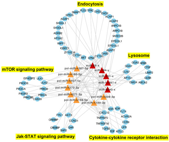 The immune-related network formed by interactive DEmiRs (differentially expressed miRNAs) and DETGs (differentially expressed target genes of the DEmiRs). The blue round nodes indicate immune-related targeted DETGs; the triangle nodes indicate DEmiRs, of which the known miRNAs are in red and the novel miRNAs are in orange. The pathways to which the DETGs are enriched are indicated and marked in yellow.