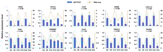 Of the five known miRNAs, miR-29-x was upregulated at all three time points and targeted two EH domain-containing protein 2 (EHD2) genes; miR-194-y was the 2nd most upregulated miRNA at 12 hpi and targeted epidermal growth factor receptor substrate 15 (EPS15); miR-351-x was the 4th most downregulated miRNA at 12 hpi and targeted lysosomal integral membrane protein type 2 (LIMP2); miR-11987-x was the 4th most upregulated miRNA at 24 hpi and targeted unc-51 like autophagy activating kinase 2 (ULK2) and CLN7; miR-6240-x was the 7th most upregulated miRNA at 24 hpi and targeted ULK1/2 and C-X-C motif chemokine ligand 12 (CXCL12; Figure 5). The expressions of 10 DETGs in the network, including EHD2 and EPS15 enriched in endocytosis, CLN7 and ARSB enriched in lysosome, CXCL12 and KDR enriched in cytokine–cytokine receptor interaction, CREBBP enriched in Jak-STAT signaling, and ULK1, PRKCA, and PIK3R3 enriched in mTOR signaling pathway, were validated by qRT-PCR, which showed that the results of qRT-PCR were in agreement with that of RNA-seq [23], with correlation coefficients ranging from 0.83 to 1.00 (Figure 6).