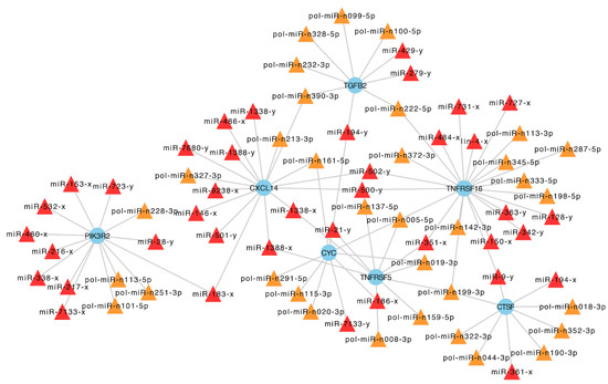 The regulatory networks formed by DEmiRs (differentially expressed miRNAs) and the hub genes identified in an mRNA transcriptome analysis of flounder infected with Vibrio anguillarum. The blue round nodes indicate hub genes; the triangle nodes indicate the DEmiRs that target the hub genes, with the known miRNAs in red and the novel miRNAs in orange.