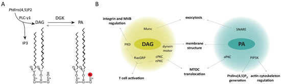 DAG is a lipid with critical functions in lipid metabolism and signaling. Recognition of antigens by T lymphocytes results in the rapid generation of DAG that is maintained and restricted to the cell–cell interface, facilitating the recruitment and modulation of proteins involved in T-cell polarization, immune synapse formation, and signaling [35]. Upon T cell–APC engagement phospholipase C γ1 (PLC-γ1)-mediated hydrolysis of phosphatidylinositol (PtdIns) (4,5)-bisphosphate (PtdIns(4,5)P2) leads to the production of inositol triphosphate (IP3) and DAG [36]. IP3 triggers the release of stored intracellular Ca2+ and activation of nuclear factor of activated T cells (NFAT)-mediated transcription [37,38]. DAG generation facilitates IS recruitment and activation of proteins containing DAG-binding type 1 PKC (C1) domains such as guanyl nucleotide-releasing protein for Ras1 (RasGRP1) and protein kinase C α (PKCα), that link the DAG generated at the IS to the intensity of Ras/ERK activation and activator protein 1 (AP-1)-dependent transcription [39,40,41,42]. DAG also binds and activates other PKC isoforms, like PKCθ, connecting DAG production to the regulation of the nuclear factor κB (NF-κB) pathway [43], as well as to the activation of the PDK-1/AKT/mTOR axis [44], which is involved in the regulation of protein synthesis, cellular metabolism, and cell survival. DAG levels are tightly regulated by diacylglycerol kinases (DGKs), which phosphorylate it into phosphatidic acid (PA), limiting recruitment of DAG effectors and the activation of downstream signaling pathways [35] (Figure 1A). In T lymphocytes, the main DGK isoforms contributing to DAG attenuation are type I DGKα and type IV DGKζ [45,46].