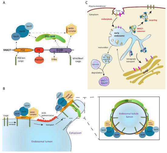 Like all members of the SNX-FERM subfamily, SNX27 contains a PX domain and a FERM-like domain. Additionally, it includes an N-terminal postsynaptic density 95/discs large/zonula occludens-1 (PDZ) domain which makes it unique within the SNX. The PDZ domain simultaneously binds to PDZ-binding motif-containing proteins and the Vps26 subunit of the retromer complex, which enhances cargo binding affinity and favors their recycling [114,116]. The PX domain mediates SNX27 localization to PtdIns(3)P-enriched endosomal membranes. Meanwhile, the FERM-like domain can recruit cargoes containing NpxY/NxxY motifs in vitro, engage K-Ras in a GTP-dependent manner [92,95], and bind bi- and tri-phosphorylated PI [117]. Moreover, this domain interacts with SNX-BAR proteins and the WASH complex [114,115], which in turn maintains the integrity of the endosomal and lysosomal network by regulating actin polymerization [19,118,119]. SNX-BARs and the WASH complex also indirectly recruit SNX27 to the retromer and situate it as a core component of the SNX27–retromer multiprotein complex [120,121] (Figure 2A).