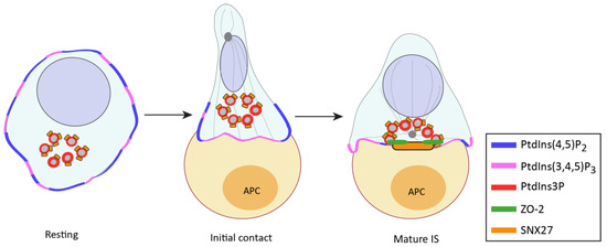 Vesicular trafficking to the IS plays a crucial role in IS assembly and function [7]; upon T-cell activation, signaling molecules organized in microclusters, as well as scaffold and adhesion proteins, traffic toward the IS and segregate in discrete supramolecular activation clusters (SMACs). The differential distribution of these molecules facilitates the spatio-temporal regulation of downstream signaling pathways, as well as the T-cell’s effector functions [8,9,10,11]. Intracellular trafficking also mediates the polarized secretion of cytokines, lytic granules, and other cargoes toward the APC, regulating cell–cell communication [12,13,14,15,16]. Endosomal recycling represents the main mechanism via which T lymphocytes sustain continuous expression of receptors and signaling components at the IS. Sorting of internalized cargoes from early endosomes to recycling endosomes and Golgi favors polarized trafficking at the cell–cell interface in a mechanism that involves multiple proteins and phospholipids [17]. The evolutionary conserved endosomal retromer complex, in cooperation with several sorting nexin (SNX) proteins, such as SNX27, rescues transmembrane proteins from degradation and regulates their recycling [18]. The interaction of the retromer with the Wiskott–Aldrich syndrome protein and SCAR homolog complex (WASH) facilitates the nucleation of F-actin, promoting retrograde transport from early endosomes [19]. WASH deficiency in T lymphocytes results in impaired TCR trafficking and signaling defects [20]. Nevertheless, not all cargoes require the retromer for their recycling and SNX alone or additional machineries such as the retriever, which uses SNX17 for cargo recognition, or CCC complexes facilitate this process [21,22,23,24]. Although not too much is known about the retriever in IS formation, SNX17 is found with the TCR at the IS, and its silencing limits TCR and lymphocyte function-associated antigen 1 (LFA-1) expression at the cell surface, affecting IS formation and T-cell activation [25]. Contrary to their recycling, cargoes can also be transported to lysosomes for their degradation, which is achieved via the activity of endosomal sorting complexes required for transport (ESCRT) [26,27]. Phospholipids are important players of membrane trafficking, as they control physical features of membranes directly, through the recruitment of proteins or by regulating cytoskeleton-associated molecules [28,29]. Particular phospholipids named phosphoinositides (PI) work together with Rab GTPases, regulatory proteins that recruit effectors involved in the formation of vesicles, as well as their traffic and fusion. Furthermore, both types of molecules define endosomal and organelle identity [30,31,32]. When PI, Rab GTPases, and their effector proteins bring membranes in close proximity, soluble NSF (N-ethylmaleimide-sensitive factor) attachment protein receptor (SNARE) proteins go into action and mediate their fusion [33,34].